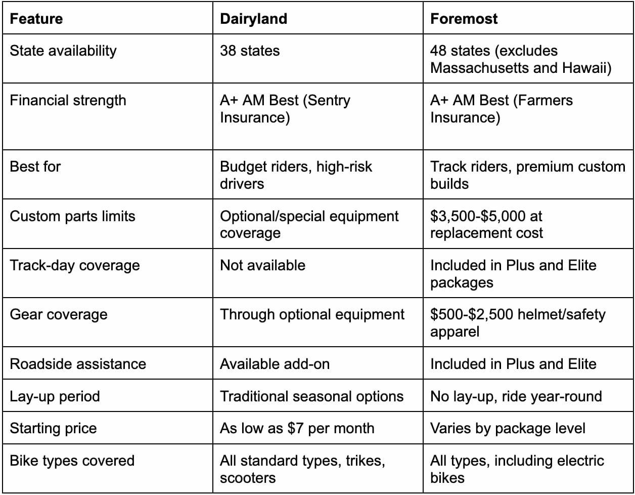 The bottom line? Dairyland wins on accessibility and affordability, while Foremost excels in premium coverage for serious riders who refuse to compromise on protection.