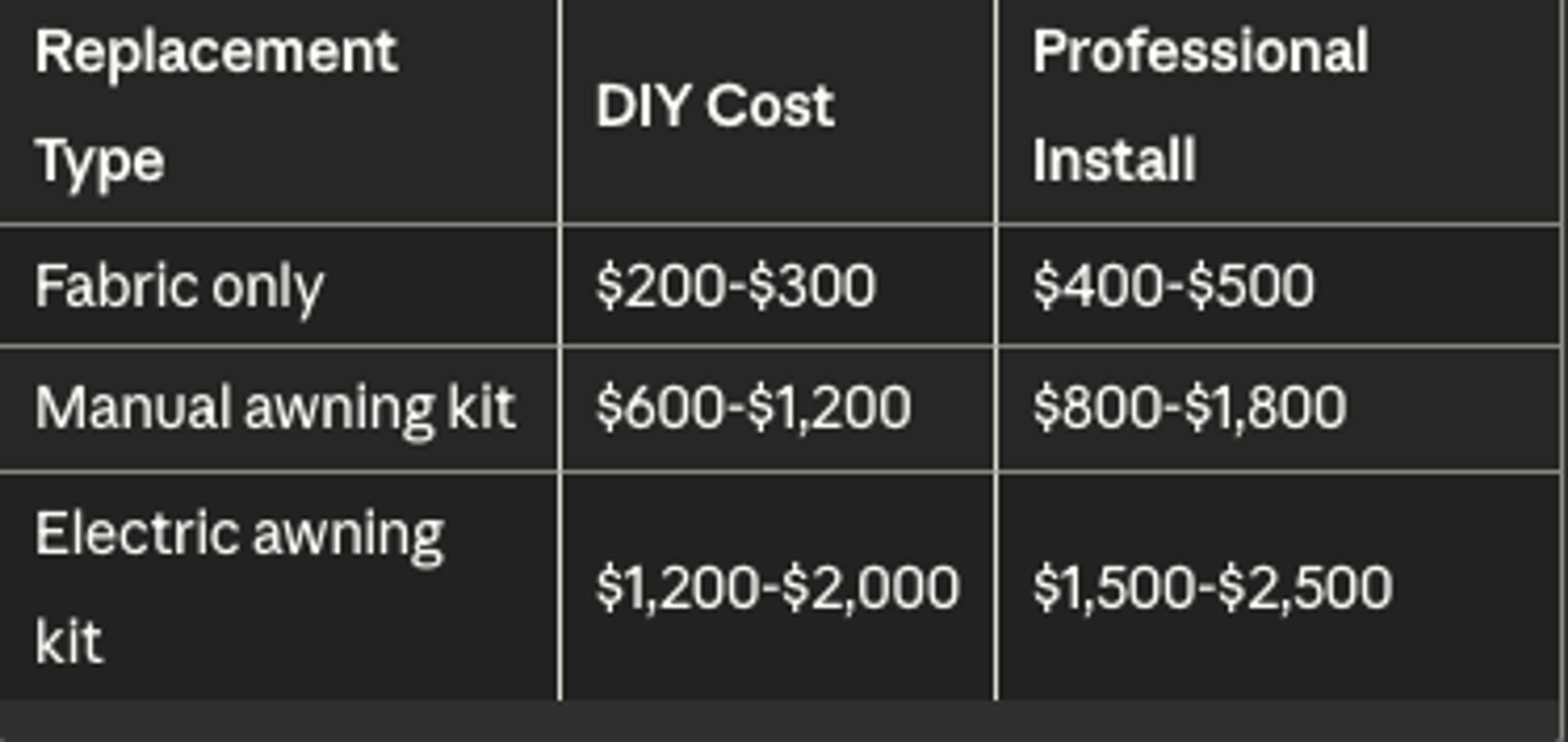 Fabric-only replacement costs $200-$300, while complete awning replacement ranges from $800-$2,500 installed, depending on size and features like manual vs. electric operation.